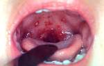 Воздействие энтеровируса может привести к герпетической ангине, которая проявляется характерными высыпаниями на слизистой миндалин, а также на твердом и мягком небе и дужках.